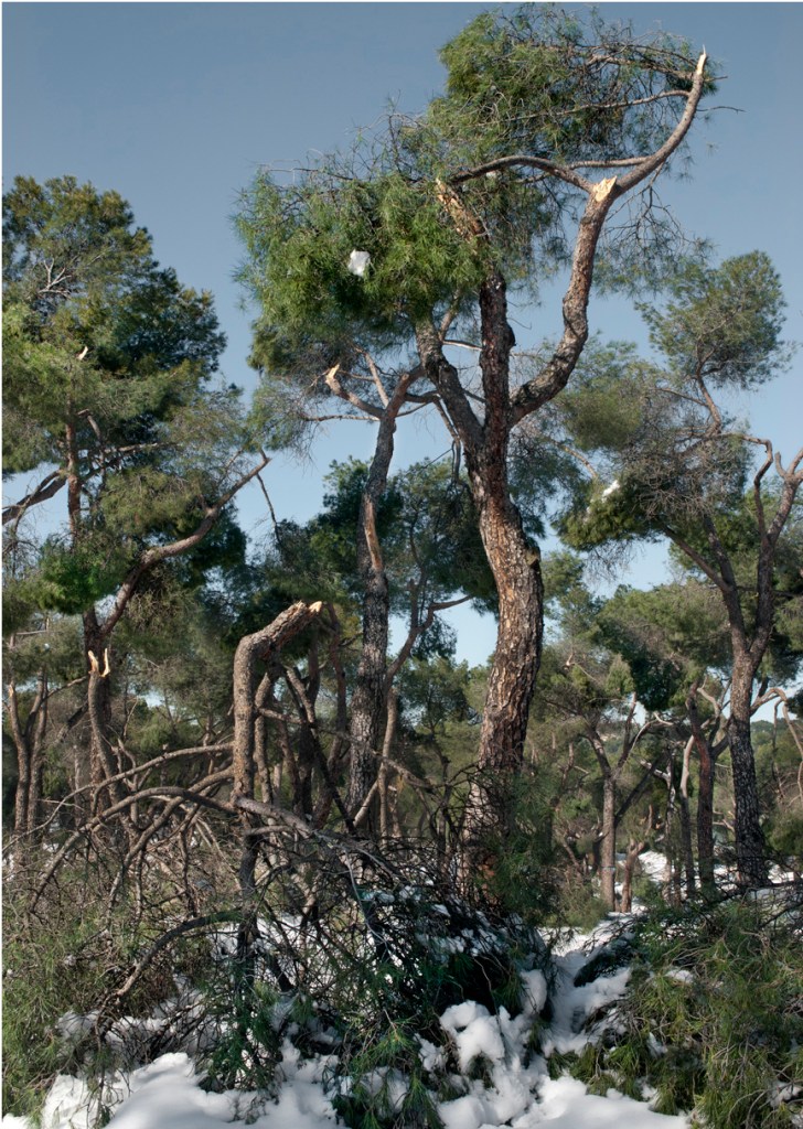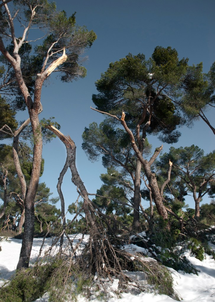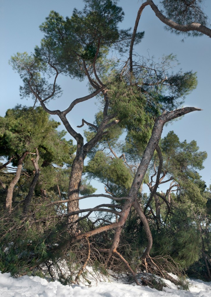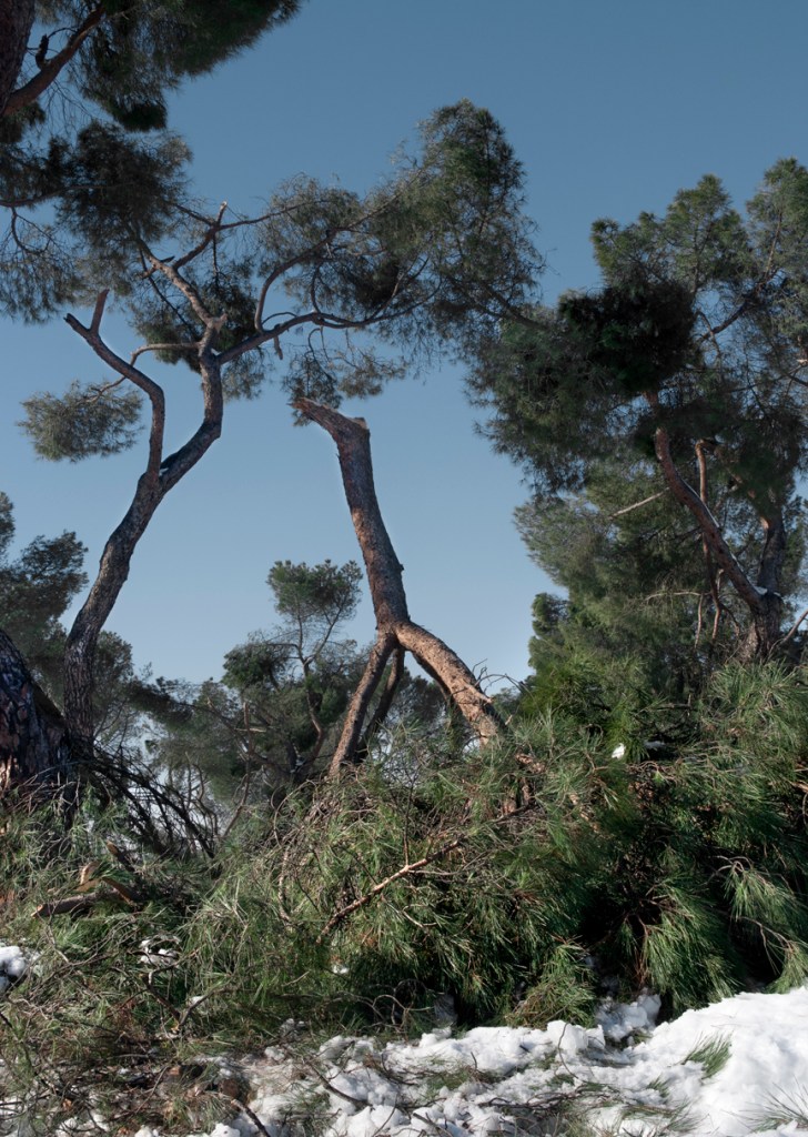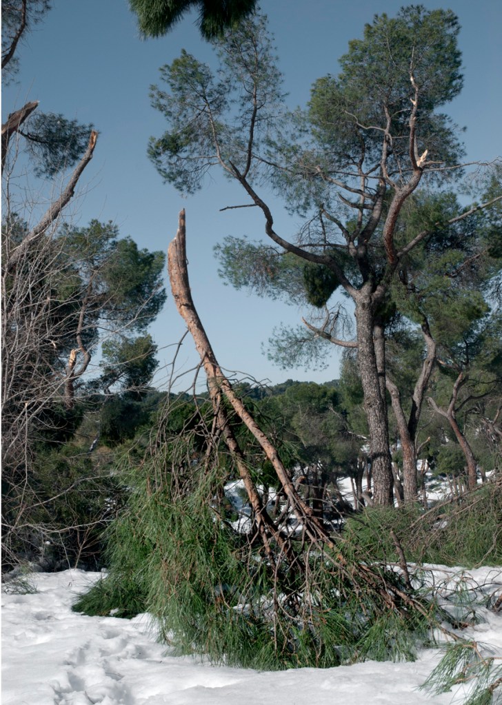 En enero de 2021, experimentamos la mayor nevada de las últimas décadas en el centro de España, un fenómeno climático anómalo y de escasos precedentes. La ciudad de Madrid quedó paralizada, sus árboles masacrados por el peso de la nieve y sus calles inundadas de una gruesa capa de hielo compacto. De estos dos sucesos urbano-naturales, esta serie revisa el primero: árboles destruidos y parques anegados. Los bosques registrados son de la Dehesa de la Villa, parque cercano a nuestro barrio y al que solemos ir con mi familia, aunque está en plena zona urbana, se caracteriza por ser un parque enorme «sin ajardinar» o «medio salvaje» que junto con Casa de Campo, fueron los terrenos verdes más afectados con la borrasca, en especial la población de pinos piñoneros.