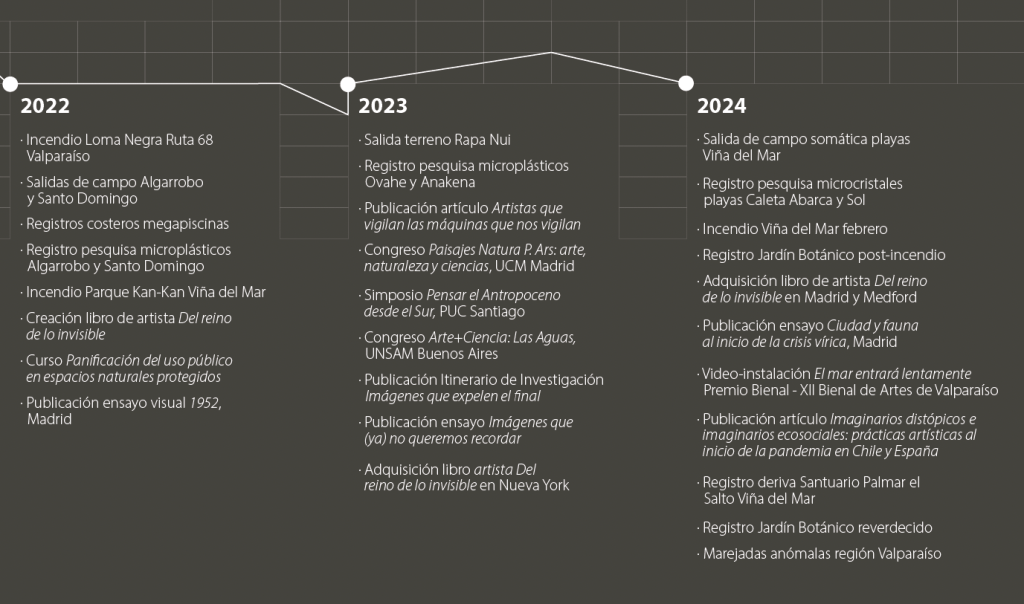 Financia: Fondecyt/ANID Postodoc n°3210188 Un mundo sin nosotros: relatos y visualidades en tiempos virulentos / Fomento a la Investigación, Facultad de Artes, Universidad Uniacc, proyecto Microplástico microscópico, entre la migración marina y la materialidad híbrida. Patrocina: Departamento de Teoría de las Artes, Universidad de Chile. ** La obra El mar entrará lentamente es parte de la Colección de Arte de la Municipalidad de Valparaíso, Premio XII Bienal de Artes 2024.