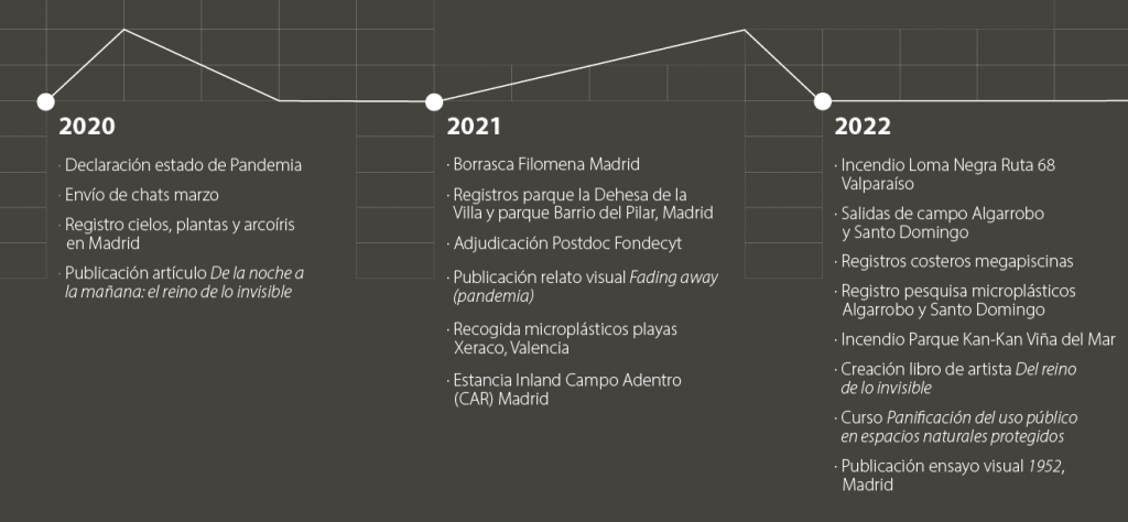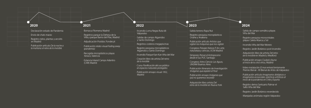Es una muestra coral, tejida por muchas personas que colaboraron, y que propone una cronología sobre cómo hemos percibido ciertos sucesos y desastres socionaturales desde marzo 2020 hasta junio 2024. Partimos pensando con la pandemia en Madrid, y terminamos con el pasado invierno de marejadas anormales en Viña del Mar.