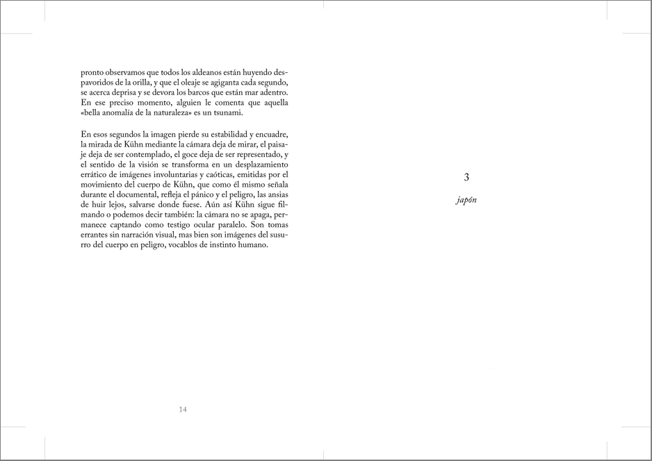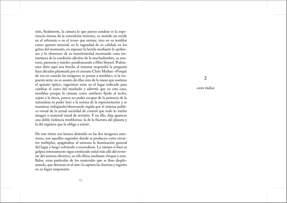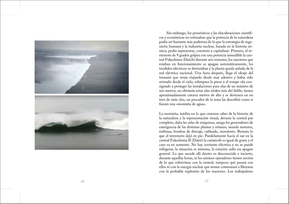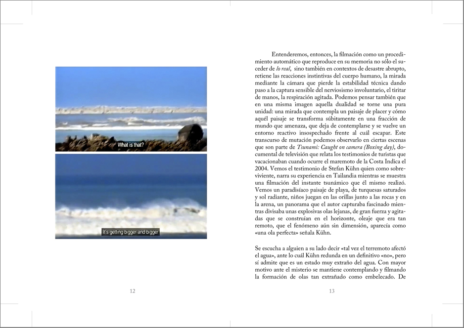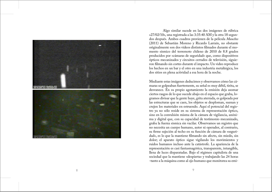 Esta obra trabaja a partir de videos encontrados en internet que registran el momento sísmico durante terremotos y tsunamis. El movimiento telúrico es retratado en dos contextos: por un lado, durante el sobresalto de personas que experimentan y filman la sacudida, por otro, durante el azote violento de cámaras de vigilancia ancladas en techos que graban de forma continua. A partir de estos videos caseros y de cámaras de control, realizo capturas de pantalla fotográficas muy veloces, de un segundo, de intencionada apariencia difusa, pixelada. Me detengo a registrar en aquella fricción producida entre experiencia y representación, en el permeable límite entre el cuerpo humano que experimenta el fenómeno y el aparato fotográfico que registra, de manera simultánea: cuando el sujeto tiembla por el sismo, cuando la imagen tiembla por el sujeto que sostiene la cámara, cuando la imagen tiembla por el sistema de control al que está sometida. El trabajo plantea cómo se han observado y representado los tres desastres sísmicos más reproducidos y mediatizados por internet del inicio del milenio: costa Índica 2004 (9.1 grados), Chile 2010 (8.8 grados) y Japón 2011(9 grados).