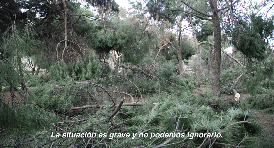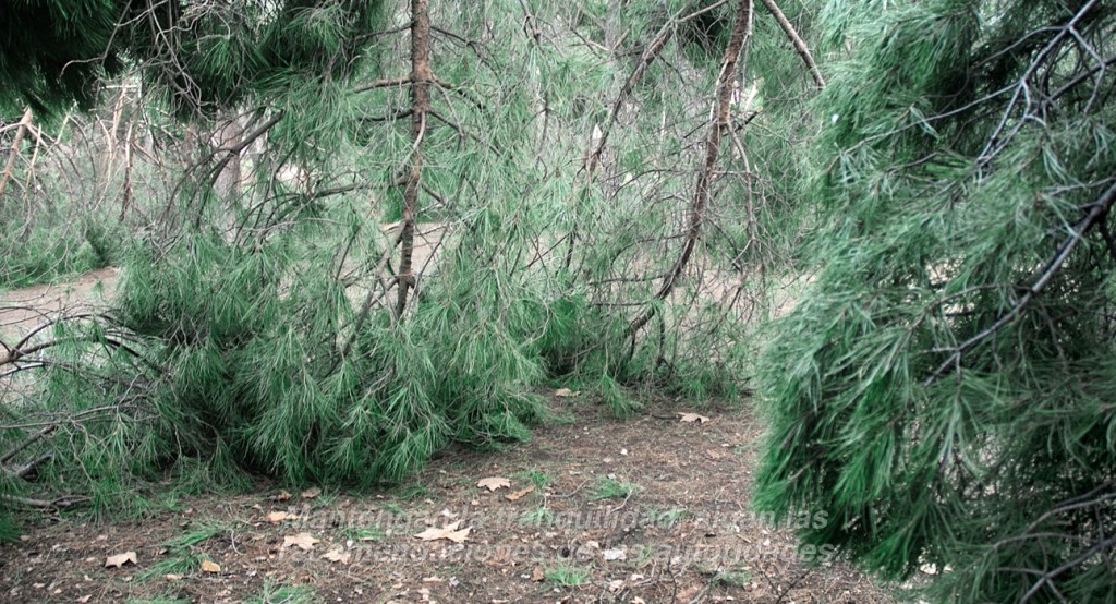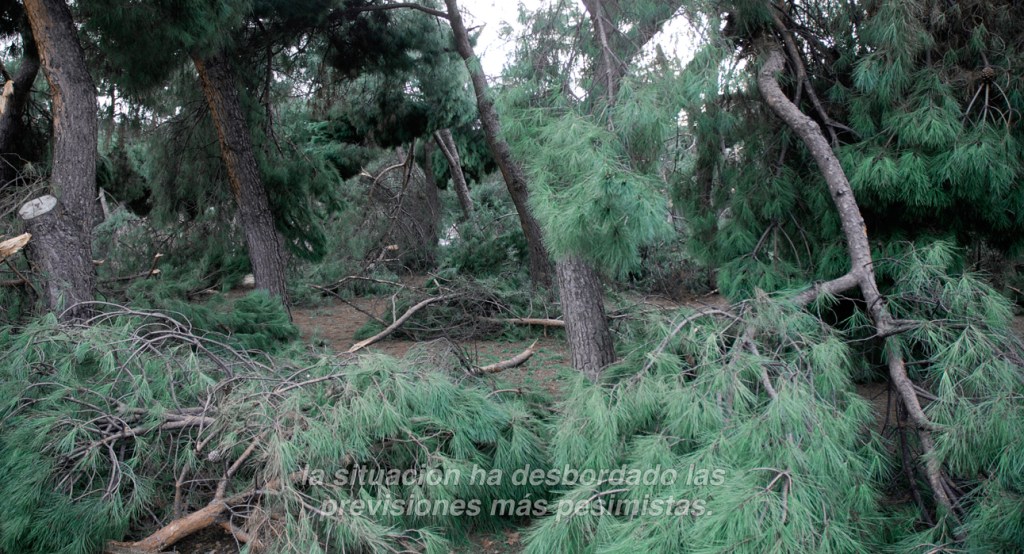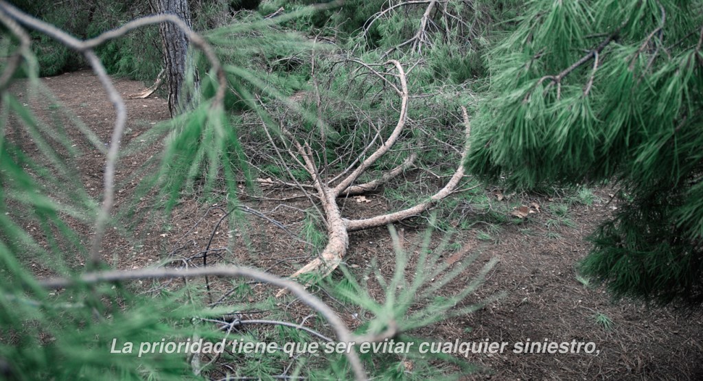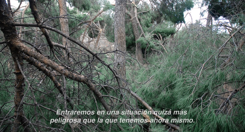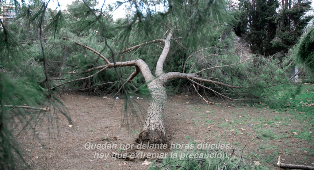 Fading away (borrasca) apela a la mayor nevada de las últimas décadas (enero/21) ocurrida en el centro de España: mientras las comparecencias del gobierno y las declaraciones de autoridades políticas intentaban tranquilizar y mantener a la ciudadanía en sus casas, la naturaleza padecía una masacre arbórea sin precedentes. Los árboles malheridos que registré postdesastre en el parque de mi barrio se contraponen con una narrativa de inseguridad que augura cómo el desborde natural nos llevará a lo desconocido.