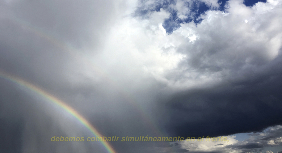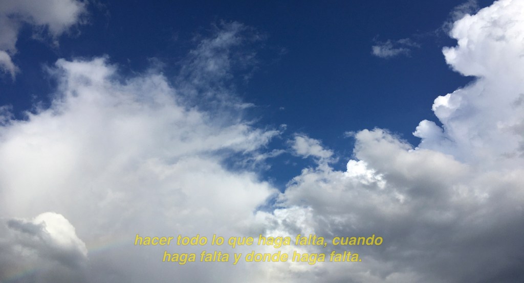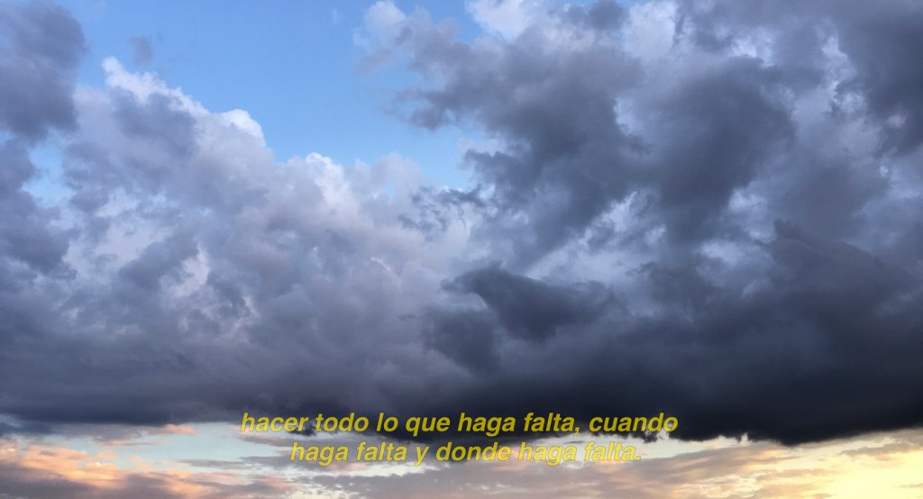 Fading away (pandemia) se remonta al inicio de la pandemia en España: mientras el discurso bélico del gobierno español y de los políticos a nivel global, intentaba contener a las muchedumbres, la naturaleza tenía un escaso respiro debido a la parálisis ciudadana y el encierro social. Los cielos que registré en aquél primer confinamiento desde mi ventana (marzo, abril/20) se contrastan con la narrativa de guerra victoriosa que, cargada de incertidumbre y espanto, va desapareciendo.