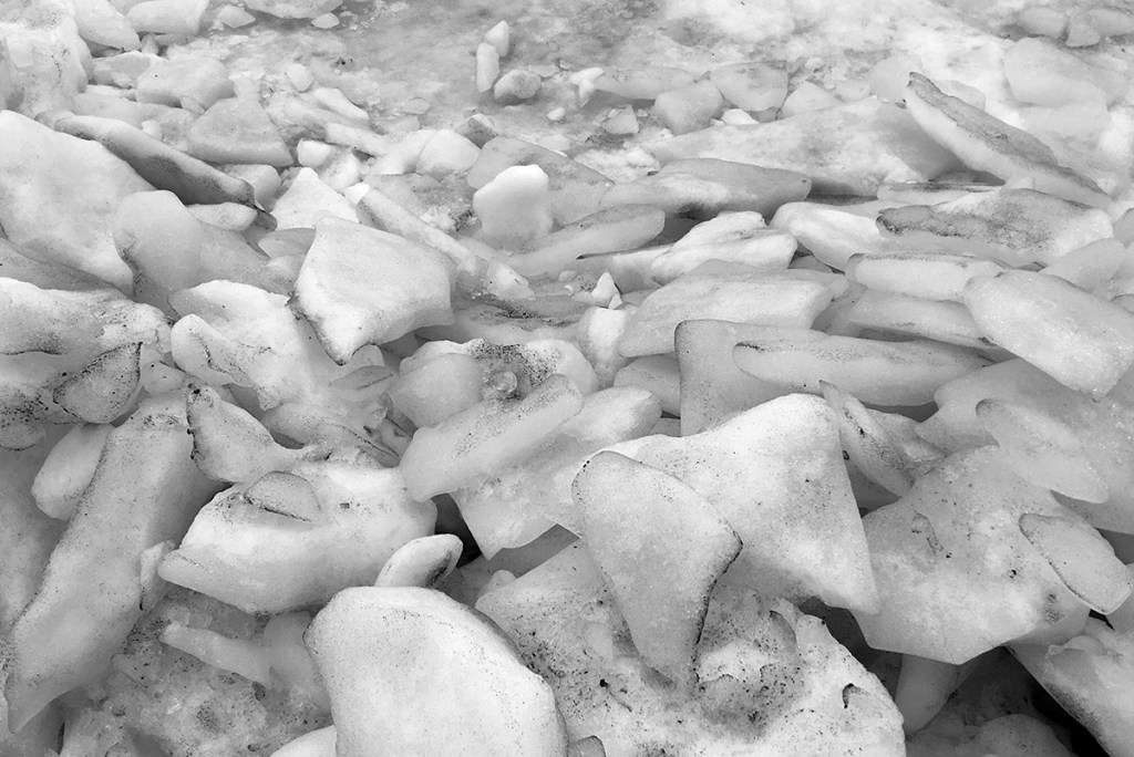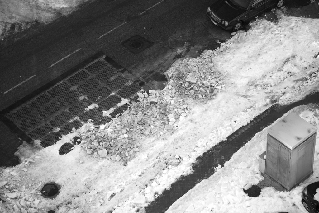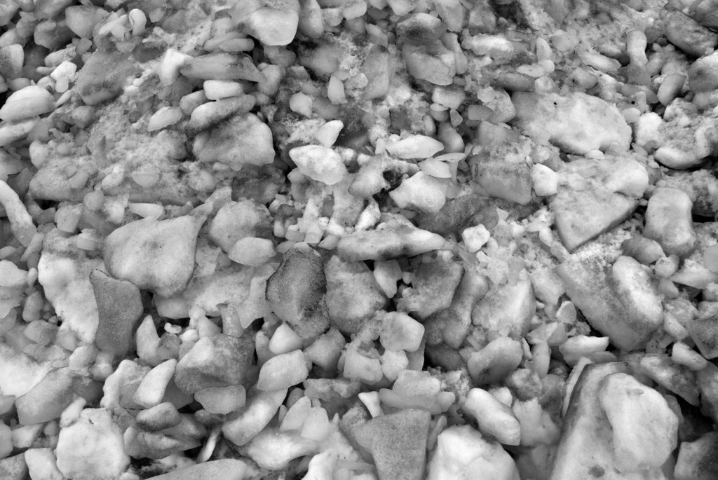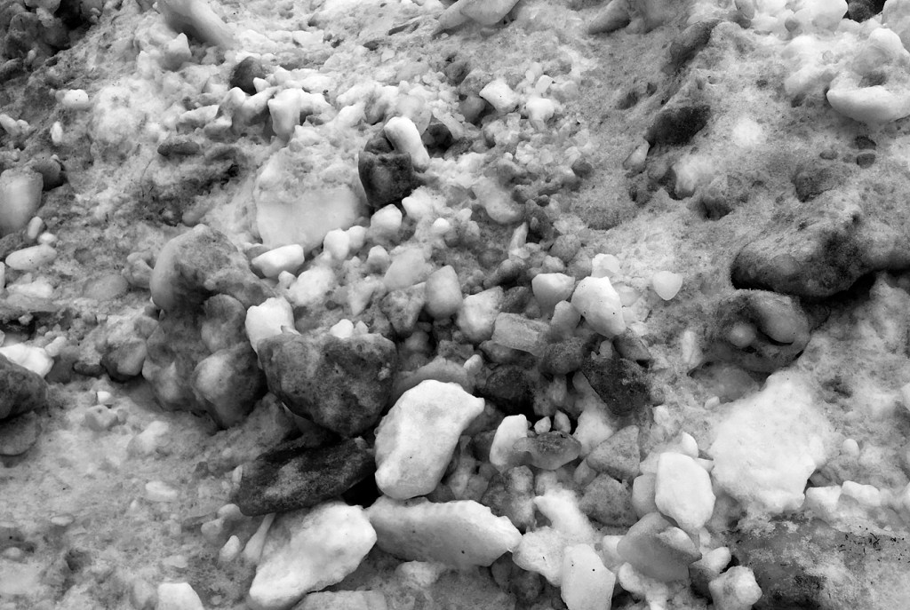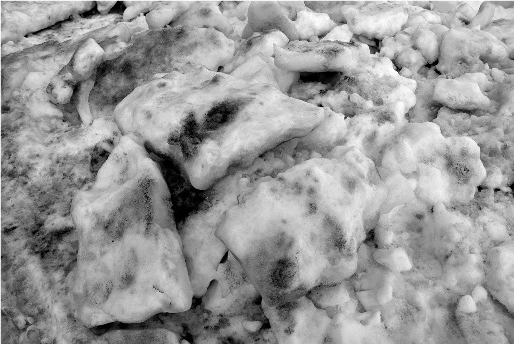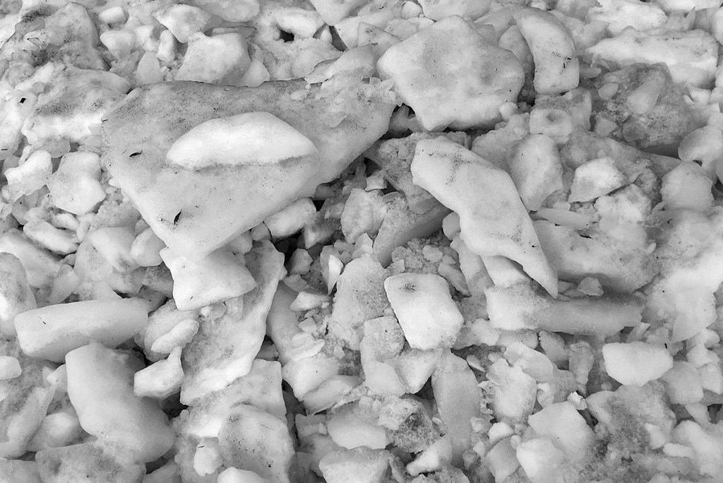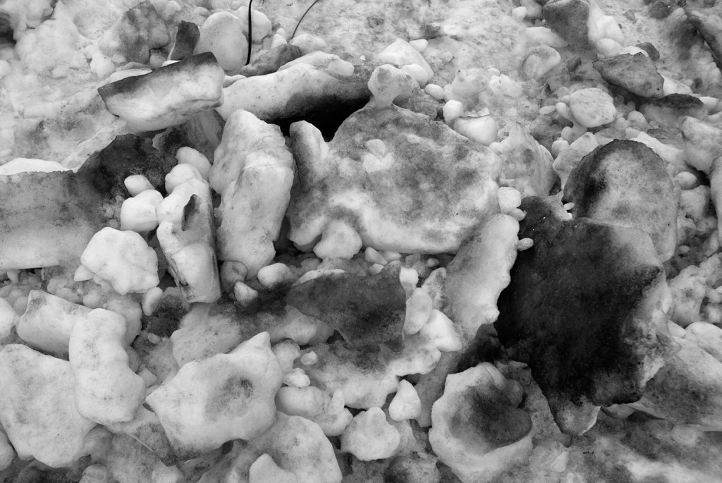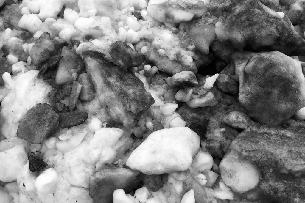 En enero de 2021, experimentamos la mayor borrasca de las últimas décadas en el centro de España, un fenómeno climático anómalo y de escasos precedentes. La ciudad de Madrid quedó paralizada, sus árboles masacrados por el peso de la nieve y sus calles inundadas de una gruesa capa de hielo compacto. De estos dos sucesos urbano-naturales, esta serie revisa el segundo: la nieve que se fue acumulando hasta transformarse en placas de hielo que se mimetizaron con la polución y el flujo humano. Estas piedras o terrones gélidos fueron parte de los cerros formados con fragmentos de las placas que eran trituradas para dejar el paso en esquinas y aceras, una amalgama blanco/negro que juntaba el hielo blanco con la contaminación y la suciedad de la urbe.