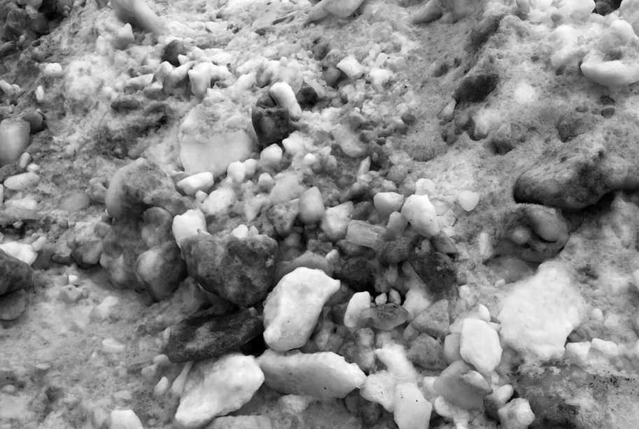 En enero de 2021, experimentamos la mayor borrasca de las últimas décadas en el centro de España, un fenómeno climático anómalo y de escasos precedentes. La ciudad de Madrid quedó paralizada, sus árboles masacrados por el peso de la nieve y sus calles inundadas de una gruesa capa de hielo compacto. De estos dos sucesos urbano-naturales, esta serie revisa el segundo: la nieve que se fue acumulando hasta transformarse en placas de hielo que se mimetizaron con la polución y el flujo humano. Estas piedras o terrones gélidos fueron parte de los cerros formados con fragmentos de las placas que eran trituradas para dejar el paso en esquinas y aceras, una amalgama blanco/negro que juntaba el hielo blanco con la contaminación y la suciedad de la urbe.